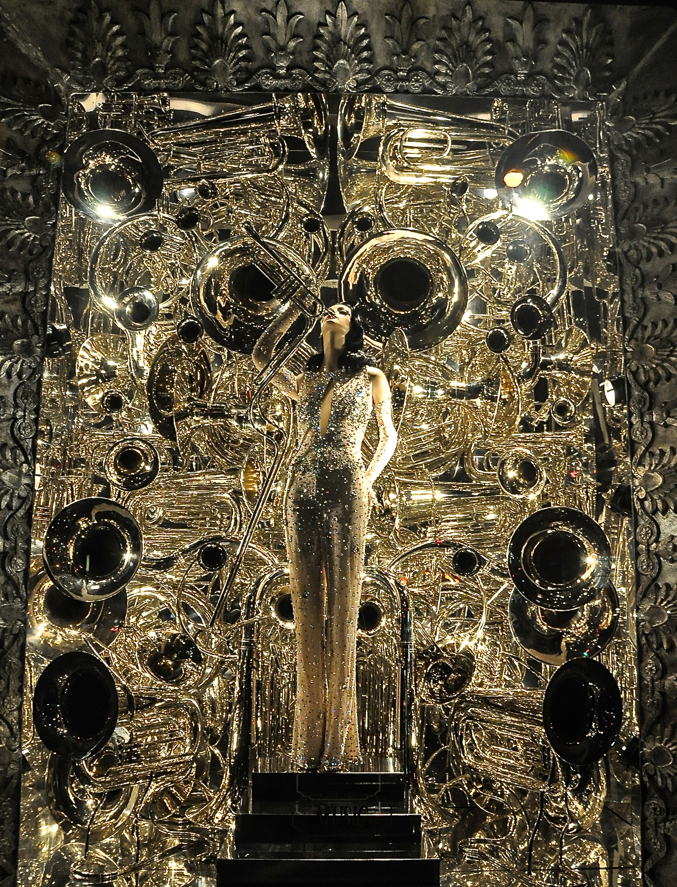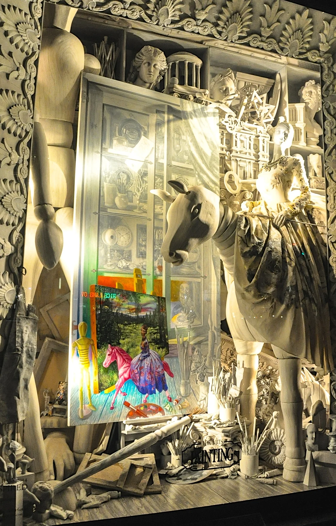 There’s a reason I drive into Manhattan before each Christmas, and it’s not primarily to take photos at festive Rockefeller Center. First and foremost, I walk with my camera a few blocks north on Fifth Avenue to the always extravagant and artful window displays at Bergdorf Goodman department store. I find these exquisite arrangements with high-end fashions such a pleasure to behold, that I wrote about them in a blog titled “Bergdorf Goodman Christmas Windows Celebrate Art and Capitalism.” The designers took the theme of this season’s windows, the concept “Inspired,” to create windows that celebrates the arts: literature, theater, painting, music, dance, sculpture, film, and architecture. I think my photos capture them in all their glory.