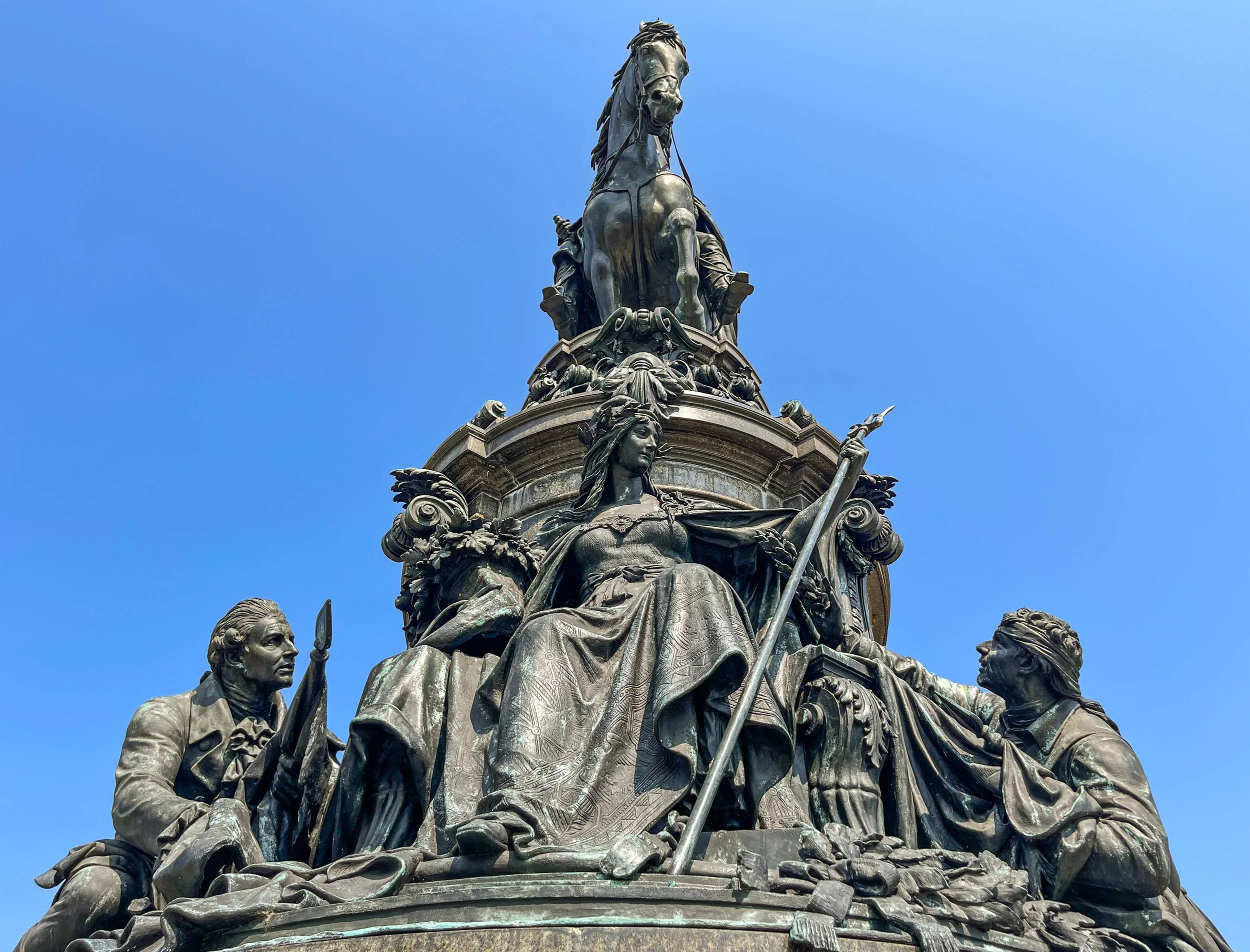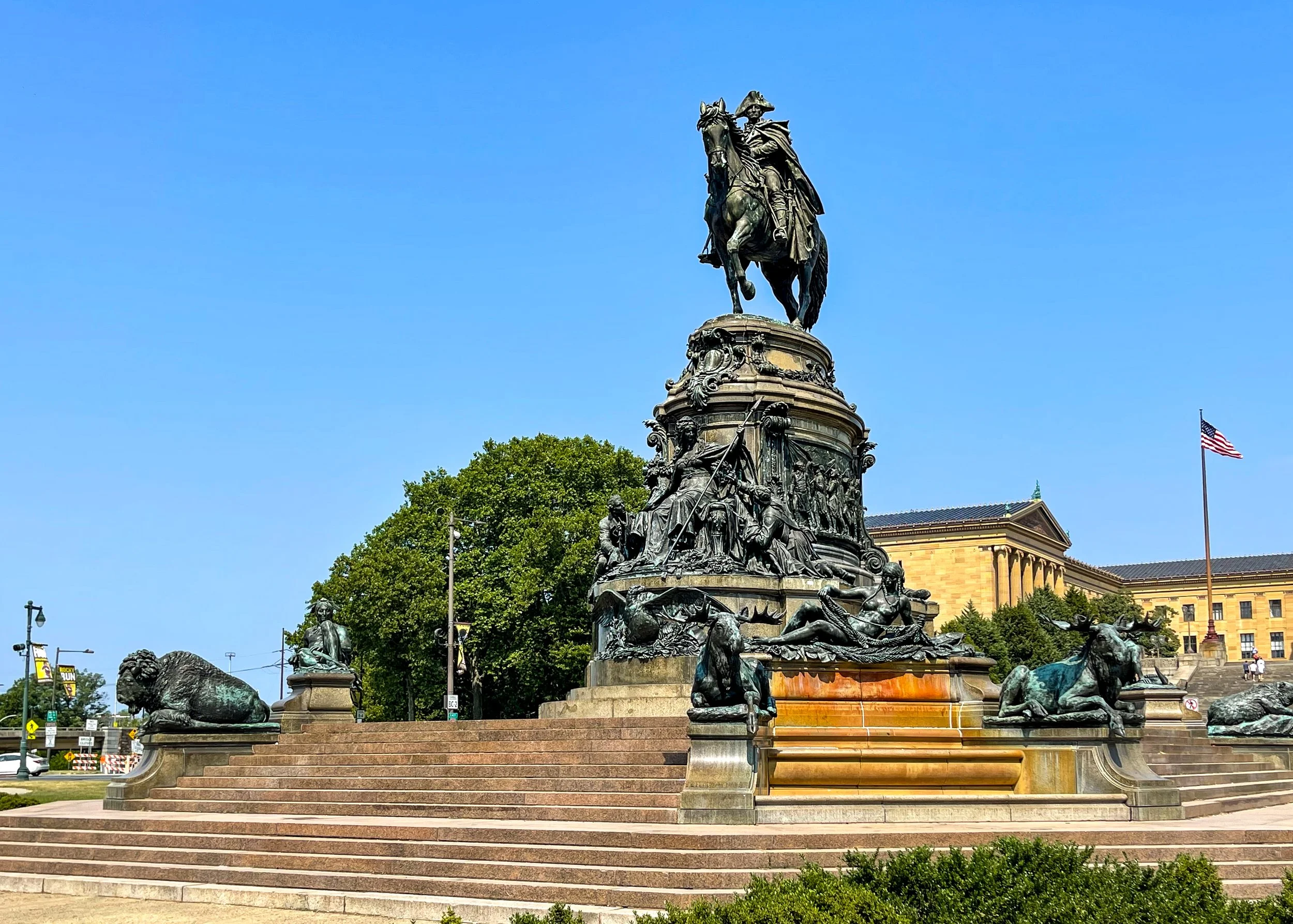 Concrete paths drew me to the multi-tiered bronze-and-granite artwork with multiple human and animal sculptures, crowned by an equestrian George Washington, in military cape and tricorn hat, as he peered down Benjamin Franklin Parkway. Surrounded by the 8-acre traffic roundabout Eakins Oval, this monument stood across from the museum's famous Rocky Steps and classical facade, providing an ideal backdrop for the photographs I started snapping.